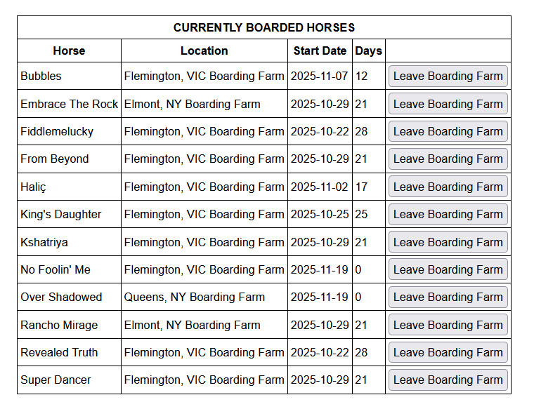 Might be a minor one but when I view my boarding page horses that I know I’ve shipped back to the track and racing still remain in the boarded horses list. I removed them again (one, Kshatriya raced last night) but they again showed up boarding.