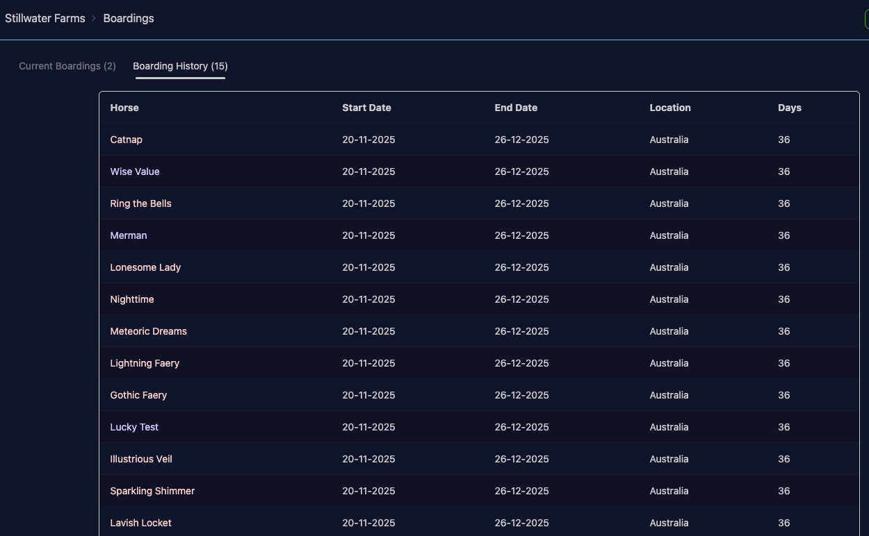 Clicking on that will show you a page with your current boardings, as well as history (for current racehorses only).