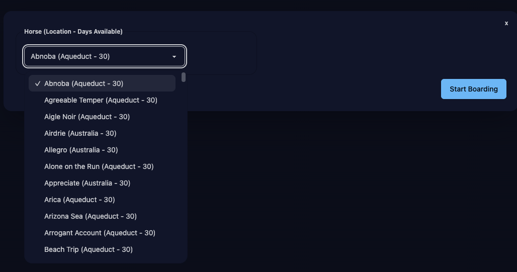 If you have horses that can be boarded (e.g. they are racehorses, they’re not in transit, they’re not at your farm, they’re not currently boarded), the Create Boarding button will show a form to select a horse to board.
