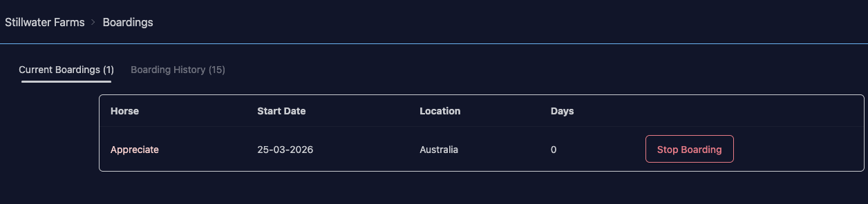 You can also start/stop boarding from an individual horse’s page.