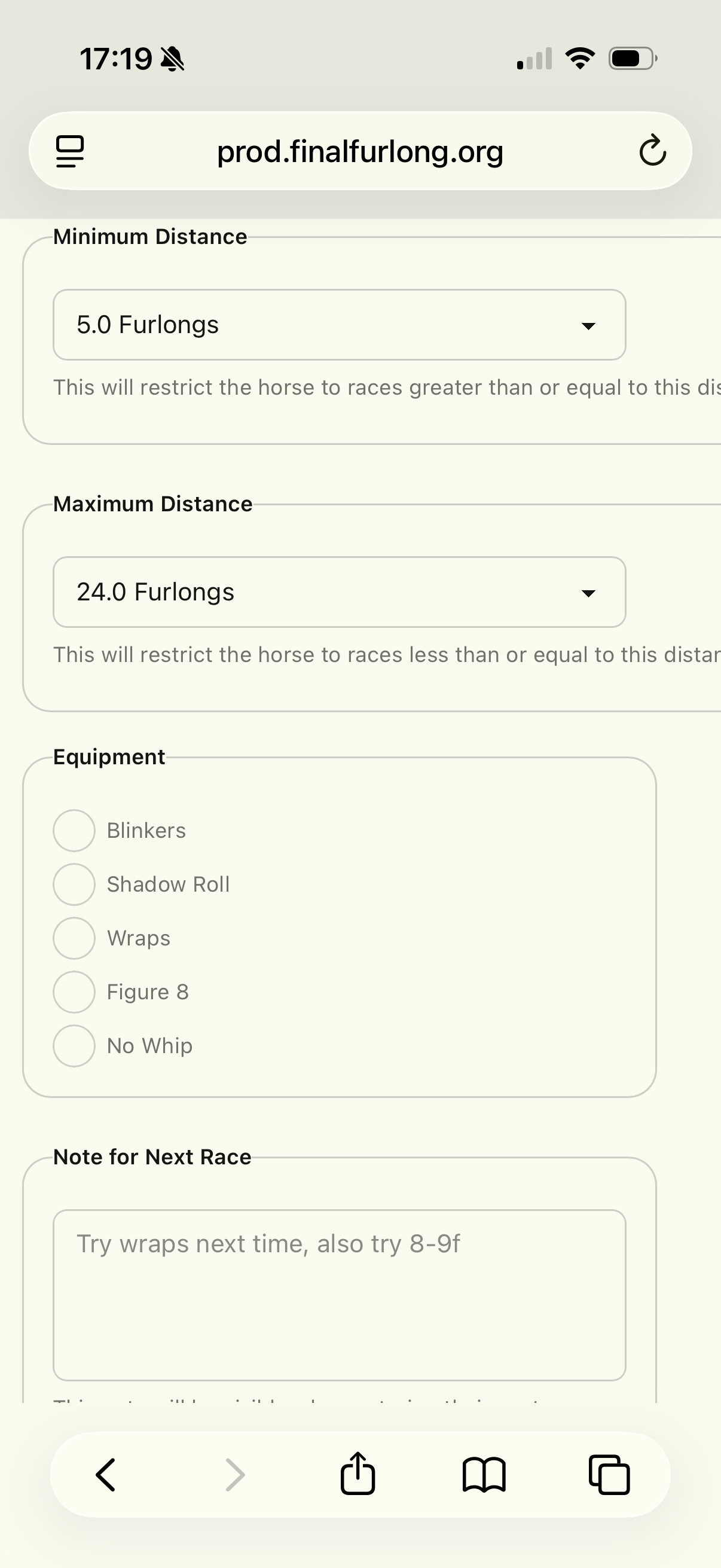 Minimum/Maximum Distance - this one is new, if you pick distances the horse will only show up for races within that range. The suggested distance (if any) is based on your horse’s previous performance. If they place in the top 3 in a race at a given distance, the suggestion will reflect that.