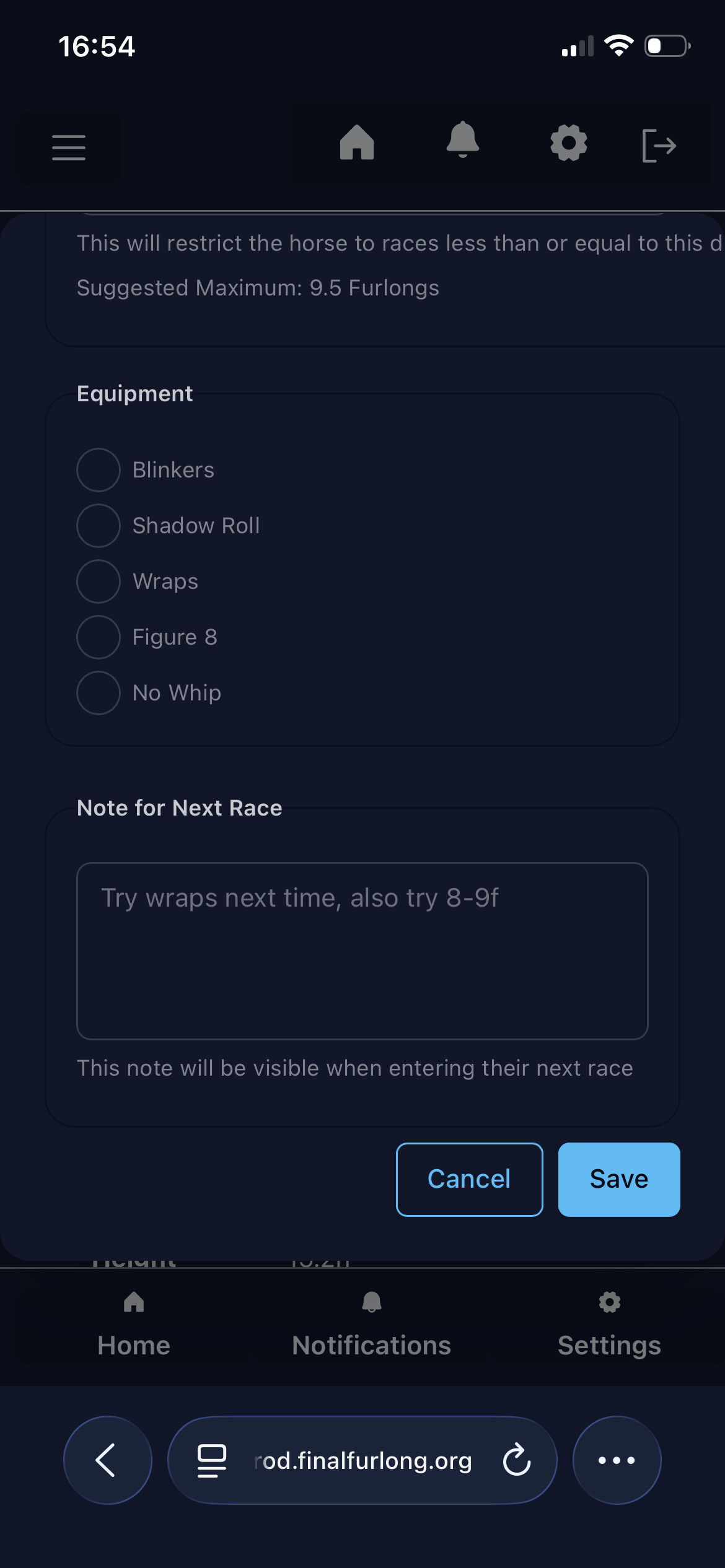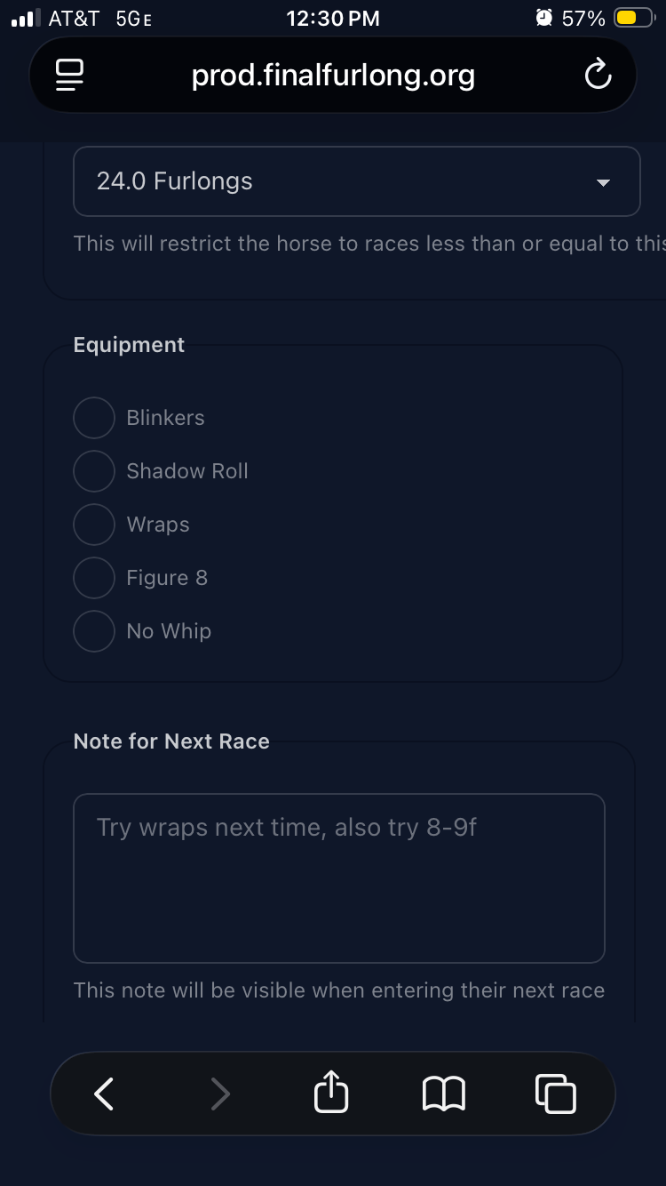 Notes for next race is also new. You can write anything you want here, and it will show up when you’re entering the horse in a race. Once the horse races, the note will be cleared, and you can create a new note if you want. As the prompt suggests, this is probably most helpful for post-race decisions, so when you see that a horse bombed in a turf sprint race, you can note down “Try long-distance turf”. Or I like to cycle through the equipment before locking it in, so I’d probably write “Use SR, try long-distance turf”.