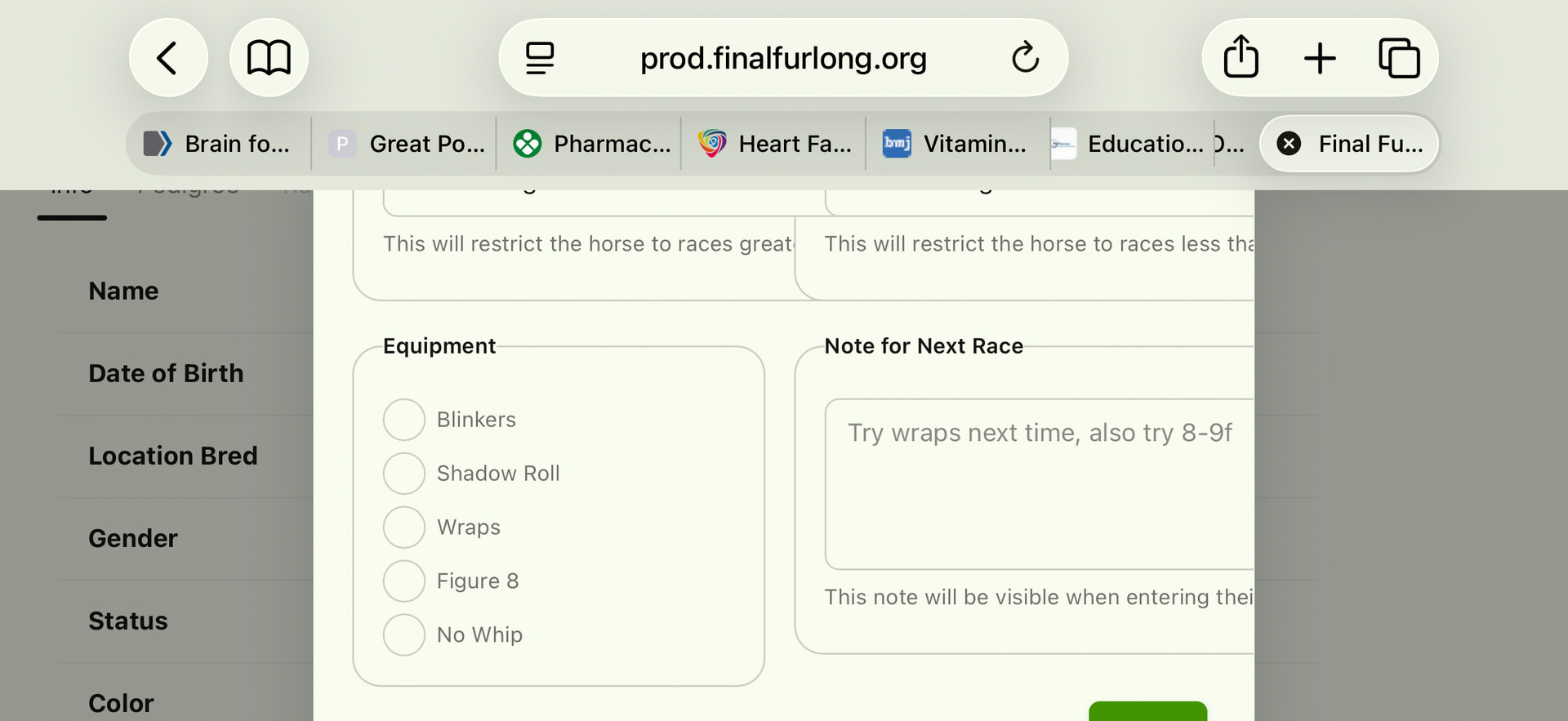I tried to change some of the options for a couple of my horses using the new software, e.g. Jockey Instructions and Preferred Jockeys. While they appeared to be changed successfully on the new database, when I go to enter one of the “changed” horses in a race, the changes aren’t showing up.