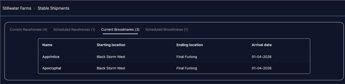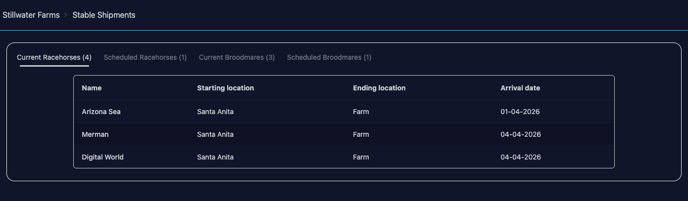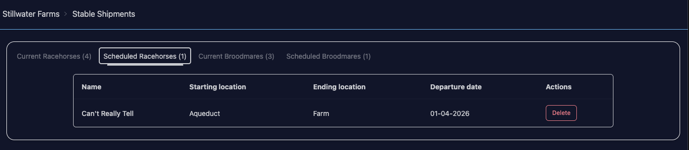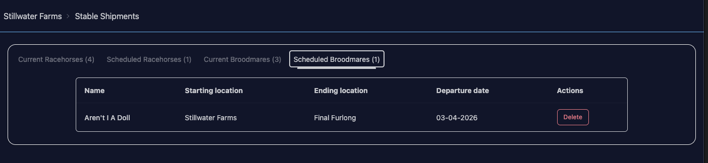 If your horse can be shipped (e.g. they’re not in transit, they’re not being boarded, they’re not entered to race), you will see Ship Horse on their page. You can select a destination & road/air as usual, but you can also select a shipment date up to 60 days in the future.