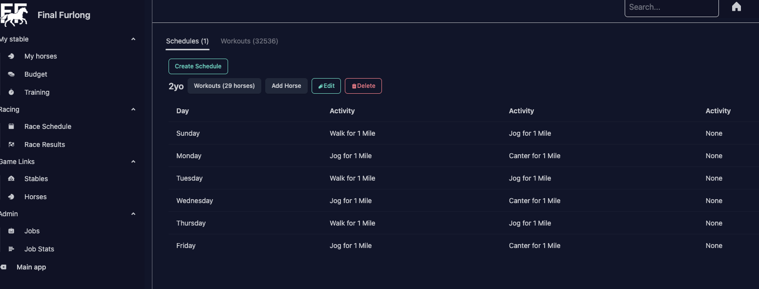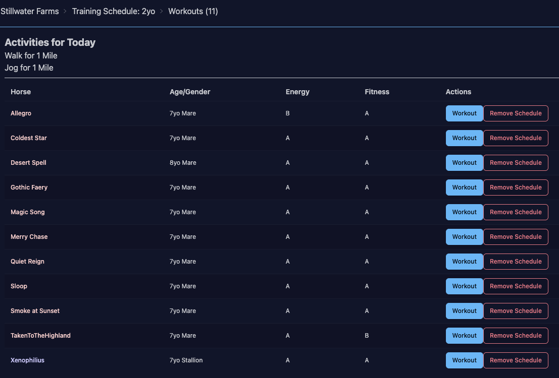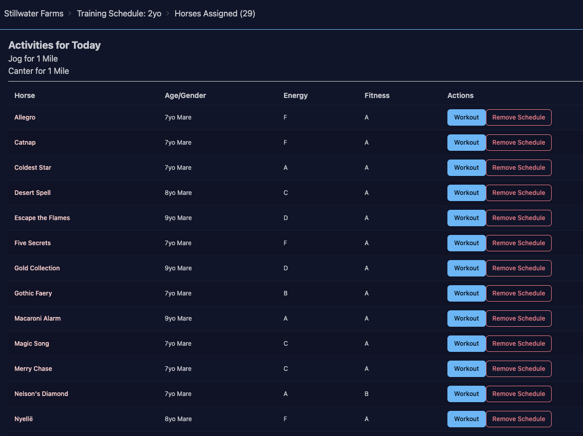 Clicking Horses gives you a list of all the horses assigned to that workout, followed by all your other racehorses who are not assigned to another schedule. You then have the option to remove the schedule from the first set, or add the schedule to the second set.