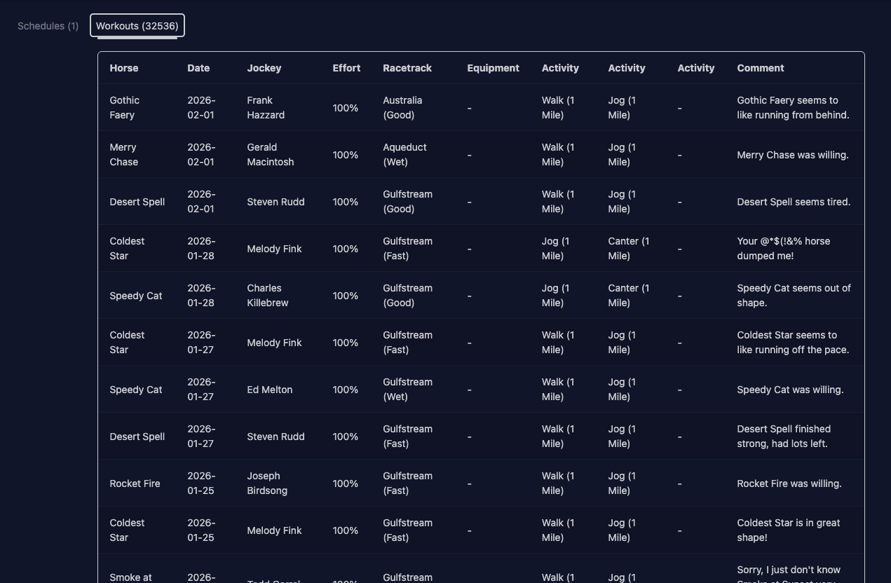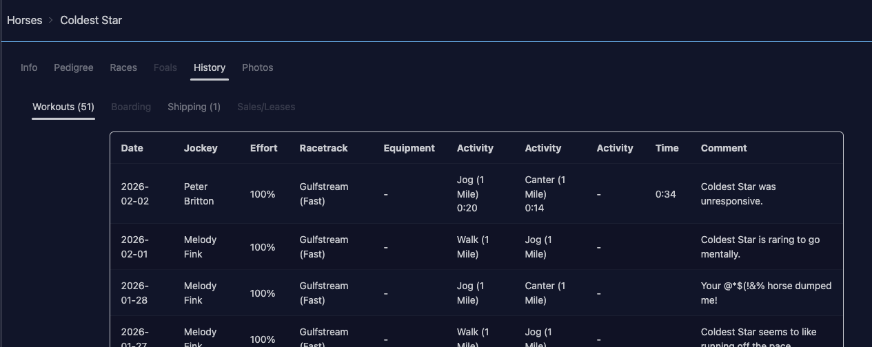 Also, if possible I’d love all the workouts to be on the same page on the individual horse pages. I usually crtl+F my way through workouts and the multiple pages are making it more difficult, lol.
