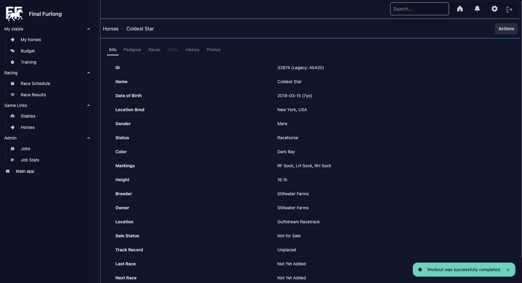 Clicking Workouts gives you the same view, but any horses that don’t have high enough energy have been filtered out. I left the “Remove Workout” button there, because why not.
