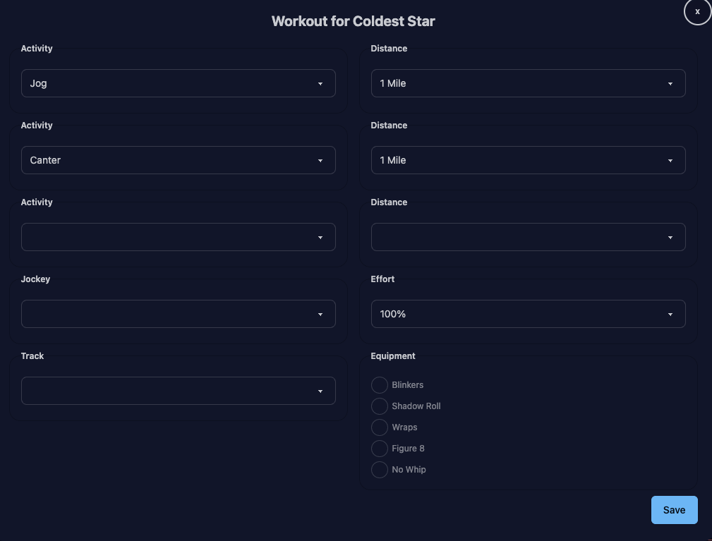 Clicking on Workout gives you the form to pick activities/jockey/etc