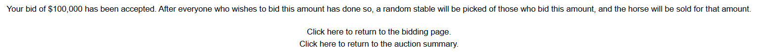Bid itself seems to go through fine, so maybe it’s just the message. I also wasn’t aware that in auctions with a max spending multiple people could bid the max amount and it would go down to a lottery, that’s really neat and makes it very fair! I always just thought the horse went to whoever bid 100k first, lol.