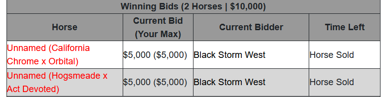 Both bids I’ve put in have given me a a message saying my bid of 100000 has been accepted. I haven’t bid that amount on either horse. It doesn’t seem to have bid 100,000 on either one but just flagging in case an issue later (sorry, in my haste to try and grab pretty ponies I didn’t get a screenshot).