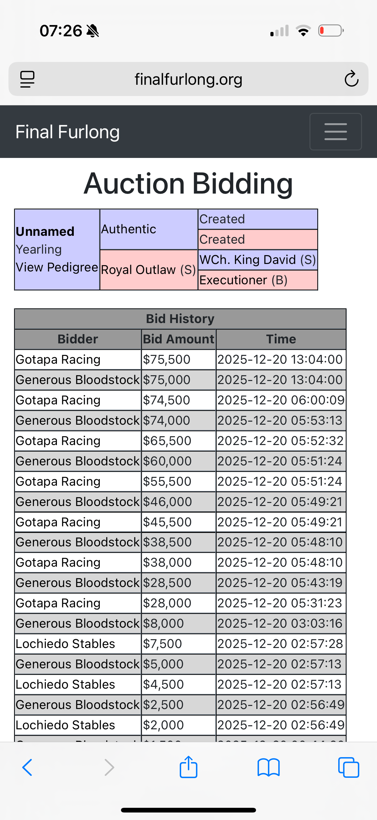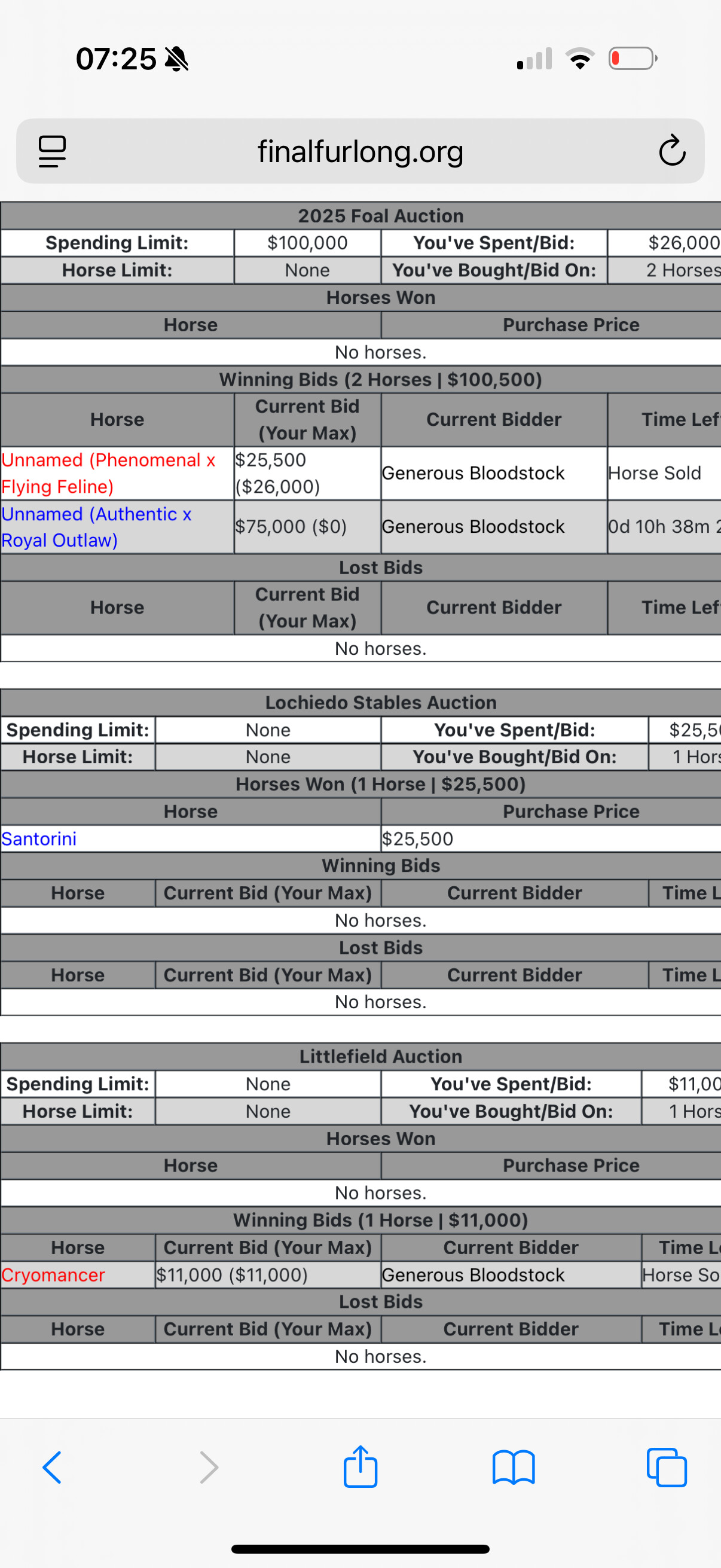 The Authentic x Royal Outlaw colt shows on the auction page and my auction summary page shows my stable as the current winning bidder but if you click on the bidding summary page it’s actually got Gotopa with the highest bid. I think the bidding page is correct as I’ve already won a horse and I wouldn’t have enough to outbid @Leah - I suspect I may have matched her high bid but not managed to exceed it. On my auction high bid page, it’s showing my max bid on this horse as 0.