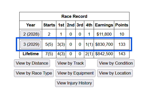 is showing the wrong information in his Race Records. It is showing him as having had 6 races and 2 wins, however, when you look at his race record, he only has had four races and no wins.