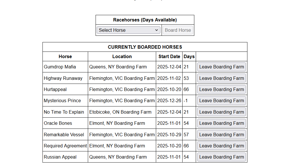 - Horses showing on the boarding page are still working out on their assigned automated schedule. The example I have here is Airwaves who I set up for boarding at the weekend. Boarding page has her listed as being at the boarding farm but I notice on my stable workouts page that she’s worked 3 of 4 days this week. She doesn’t show as being at the boarding farm on her individual page.