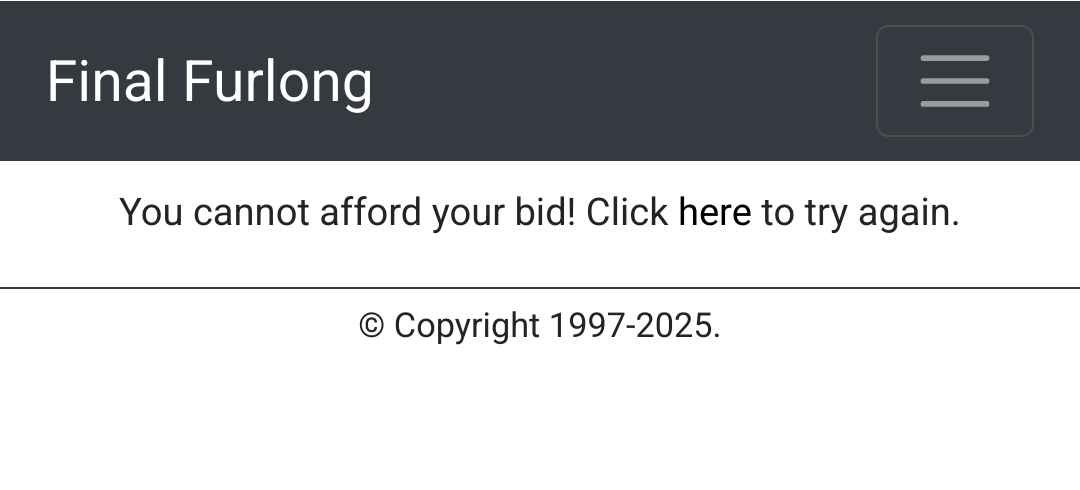 I was able to place bids on a couple of horses, where I was the first person to bid on them, however, when I tried to place a bid on a horse that somebody else has already placed a bid on, when I click on the “Place my bid” button, all I get is a blank screen and my bid doesn’t appear to get registered.