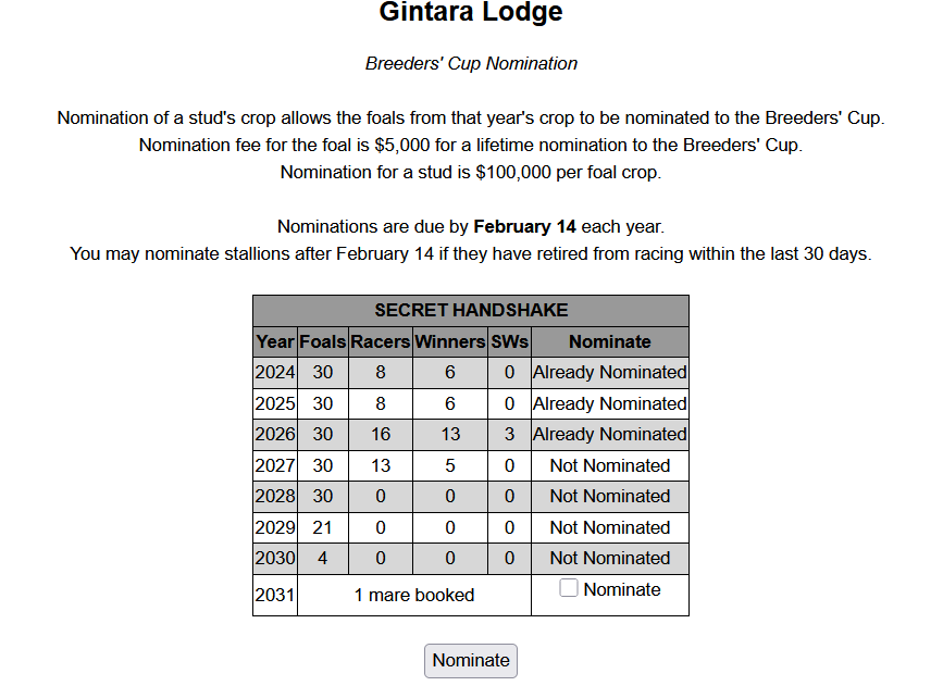 The Breeders’ Cup nomination page for stallions now lets you nominate next year’s crop of foals (the ones being bred this year). Remember that nominations are due by Feb. 14.