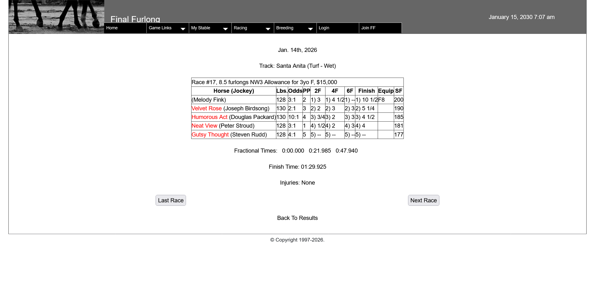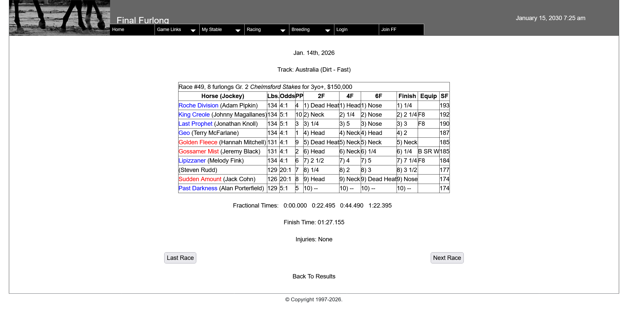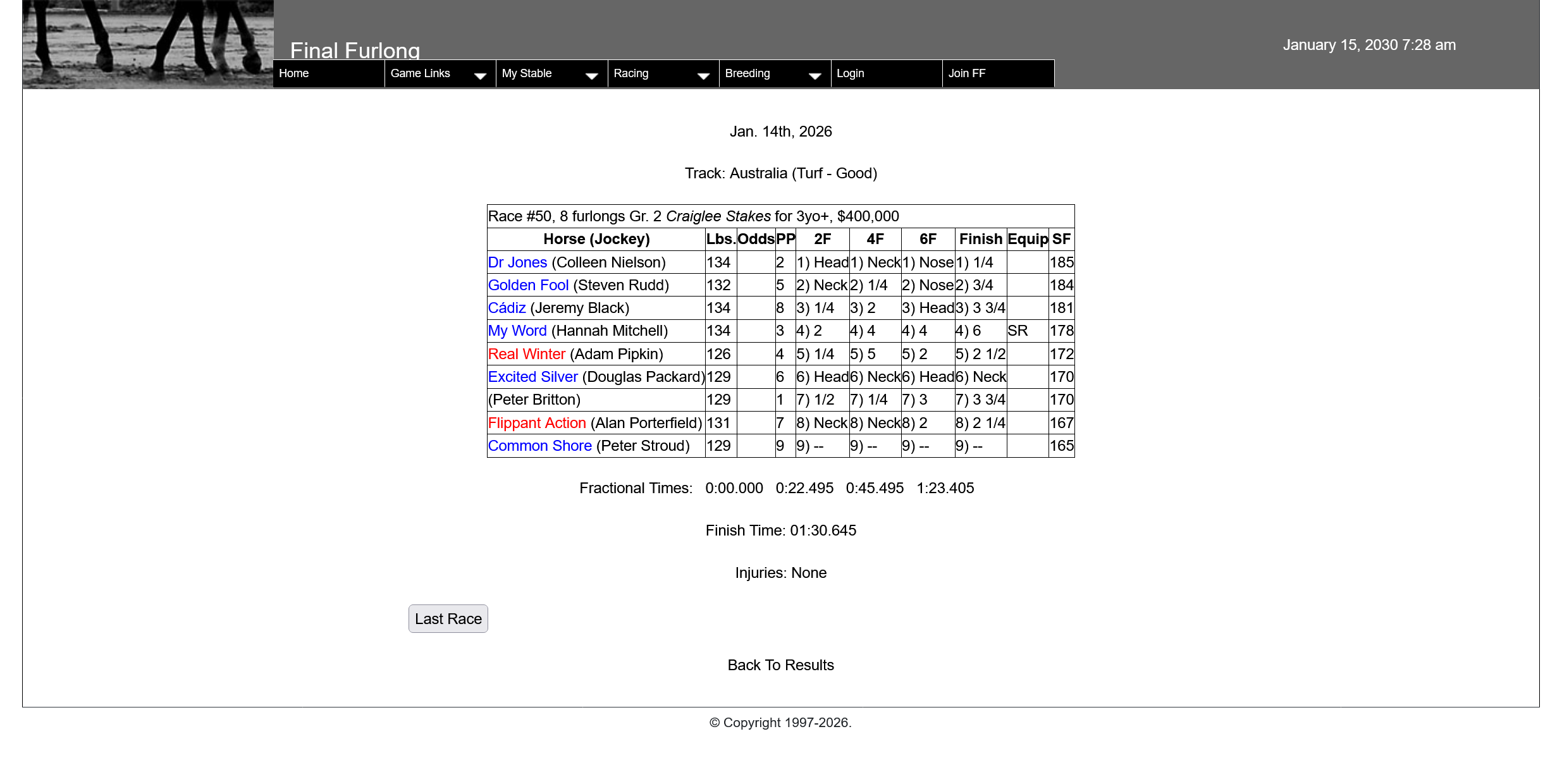All other races for yesterday show up fine (apart from the horses with no name), and, when I look at my Stable Race Results for yesterday, all three Starfish runners in Race #28 show up. In addition, the race stats do show up in the horse’s Race Records and the race does show up in the horse’s 2030 Races.